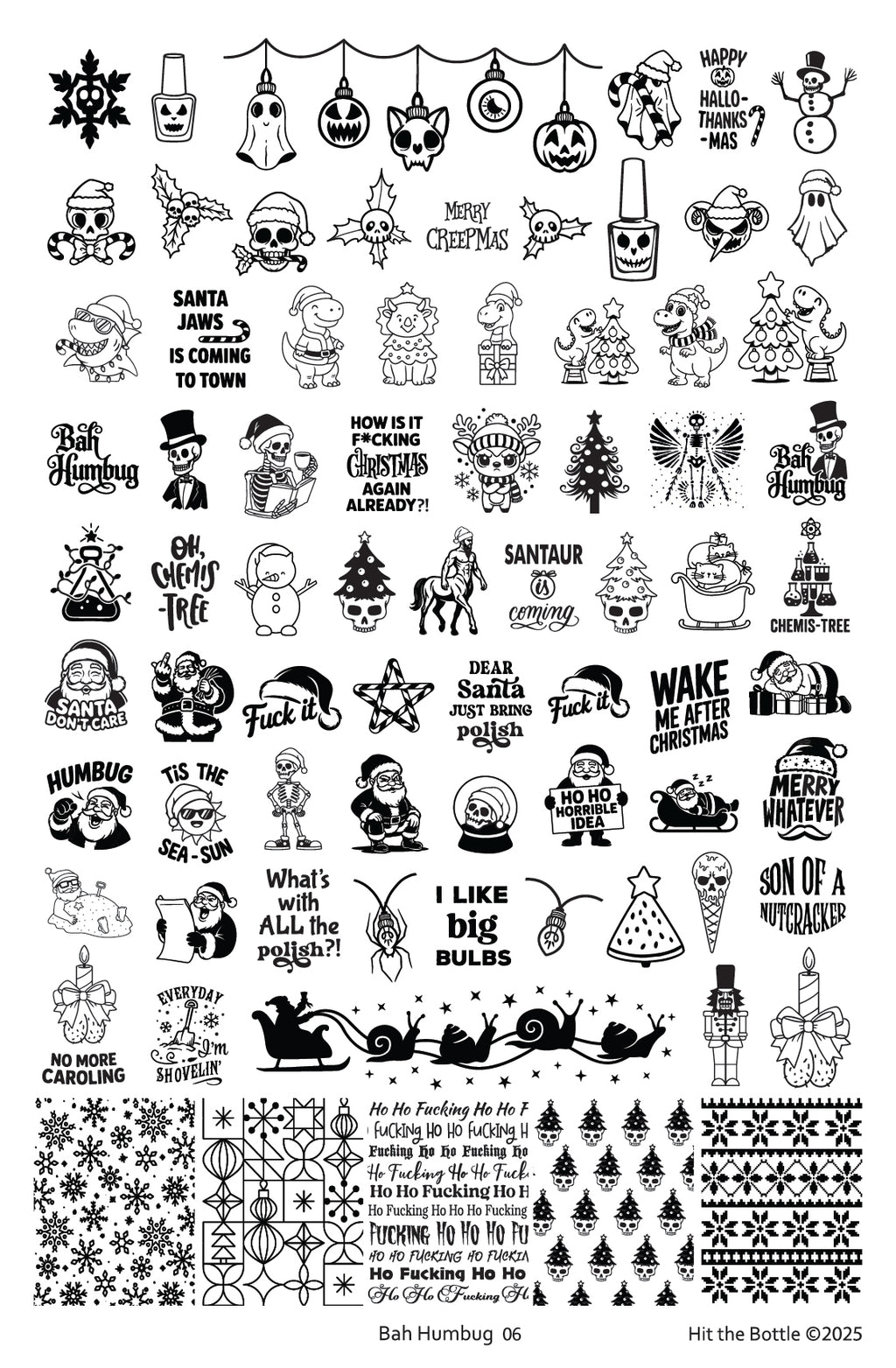 This playful stamping plate mixes Halloween vibes with Christmas chaos. You’ll find creepy skull-covered baubles, a sassy Santa, festive dinosaurs, summer-style Christmas elements, and the fan-favorite Santaur. There are cheeky sayings, clever chemis-trees for science lovers, and even the most ridiculously unexpected animal pulling Santa’s sleigh. Perfect for anyone who loves their holiday nails with attitude and humor.