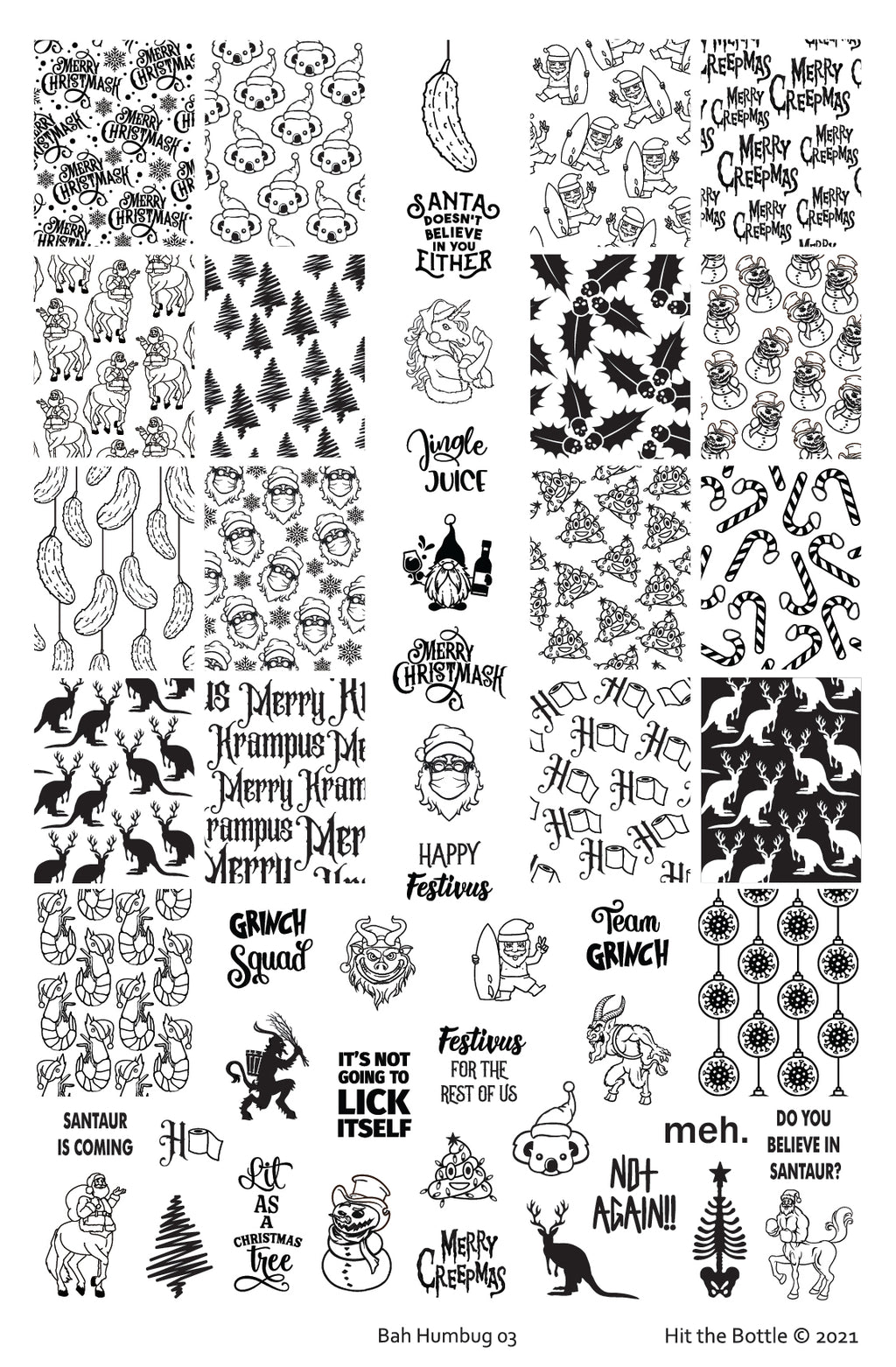 With this anti-Christmas stamping plate, you get fun and unique designs of koala bears, pickles, Santa with a surf board, creepy snowmen, poop emojis, gnome, unicorn, kangaroos with antlers, skeleton tree, centaurs, quotes and more to stamp your nails with.