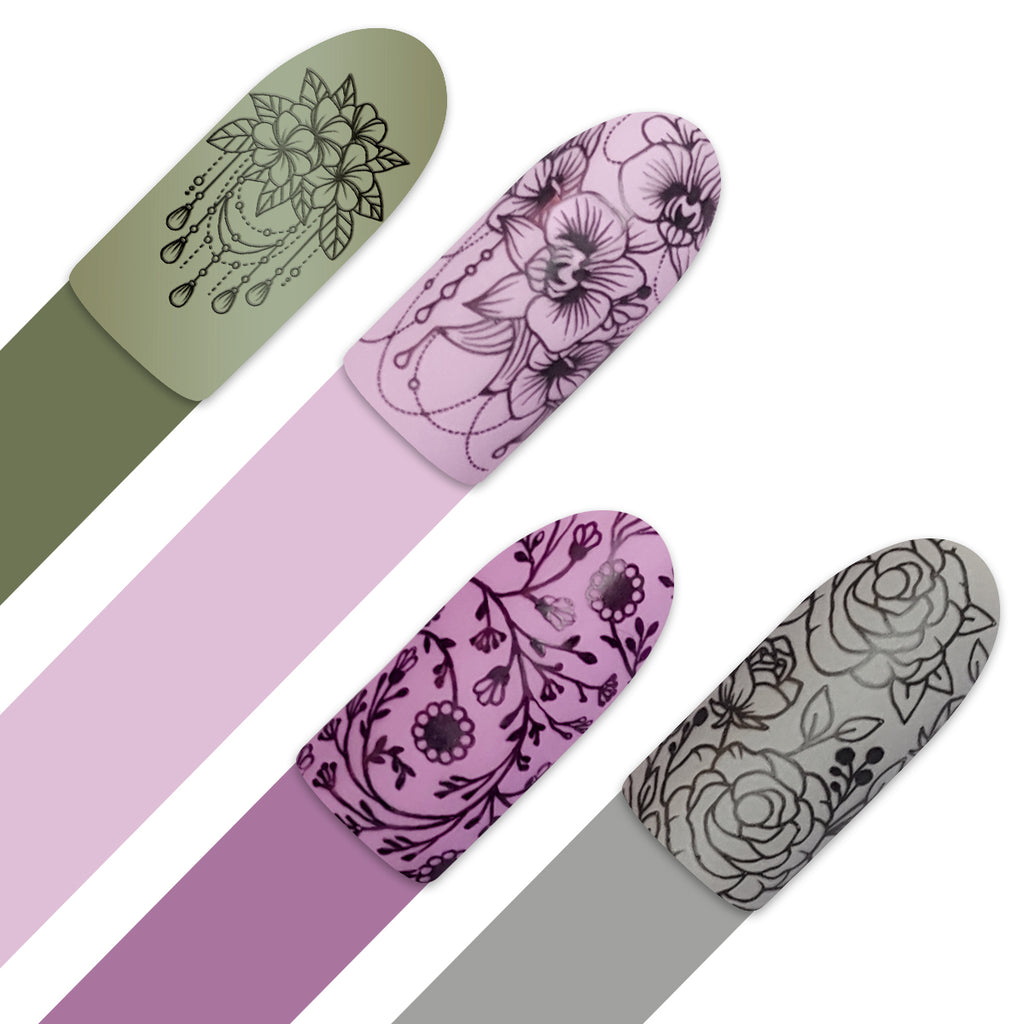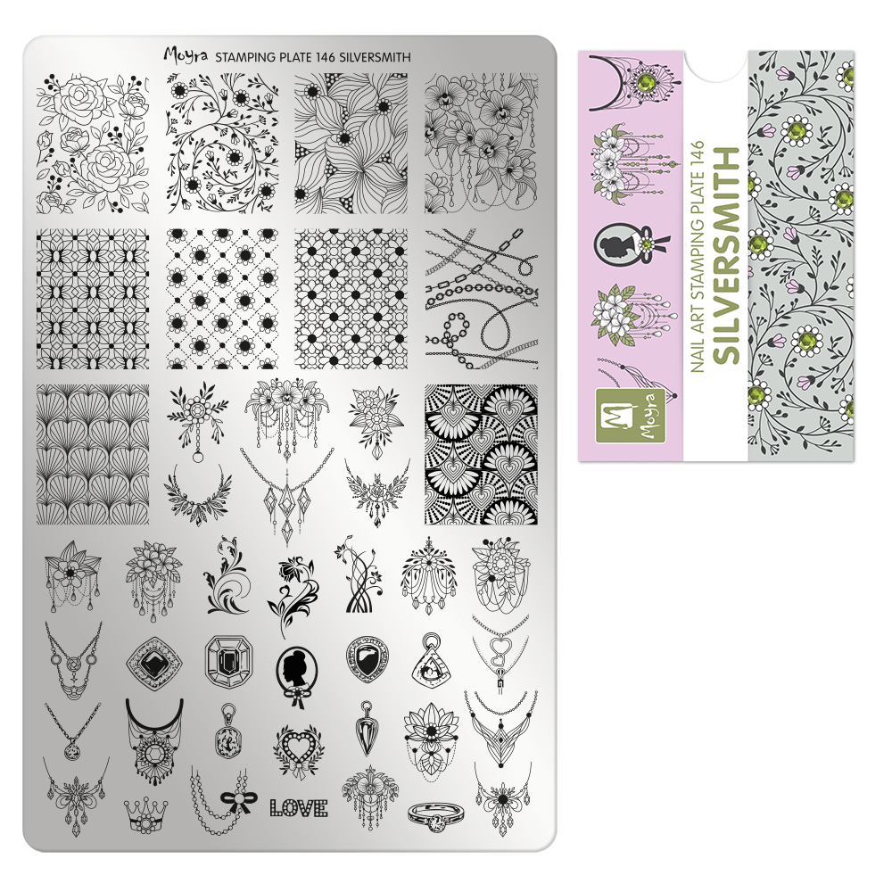 This stamping plate blends elegant florals with jewelry-inspired details. Stamp intricate flowers, art-deco patterns, dangling chains, pendants, charms, crowns, and ornate accessories. A great choice for statement nails, vintage-inspired designs, or accent art that feels detailed and luxurious.