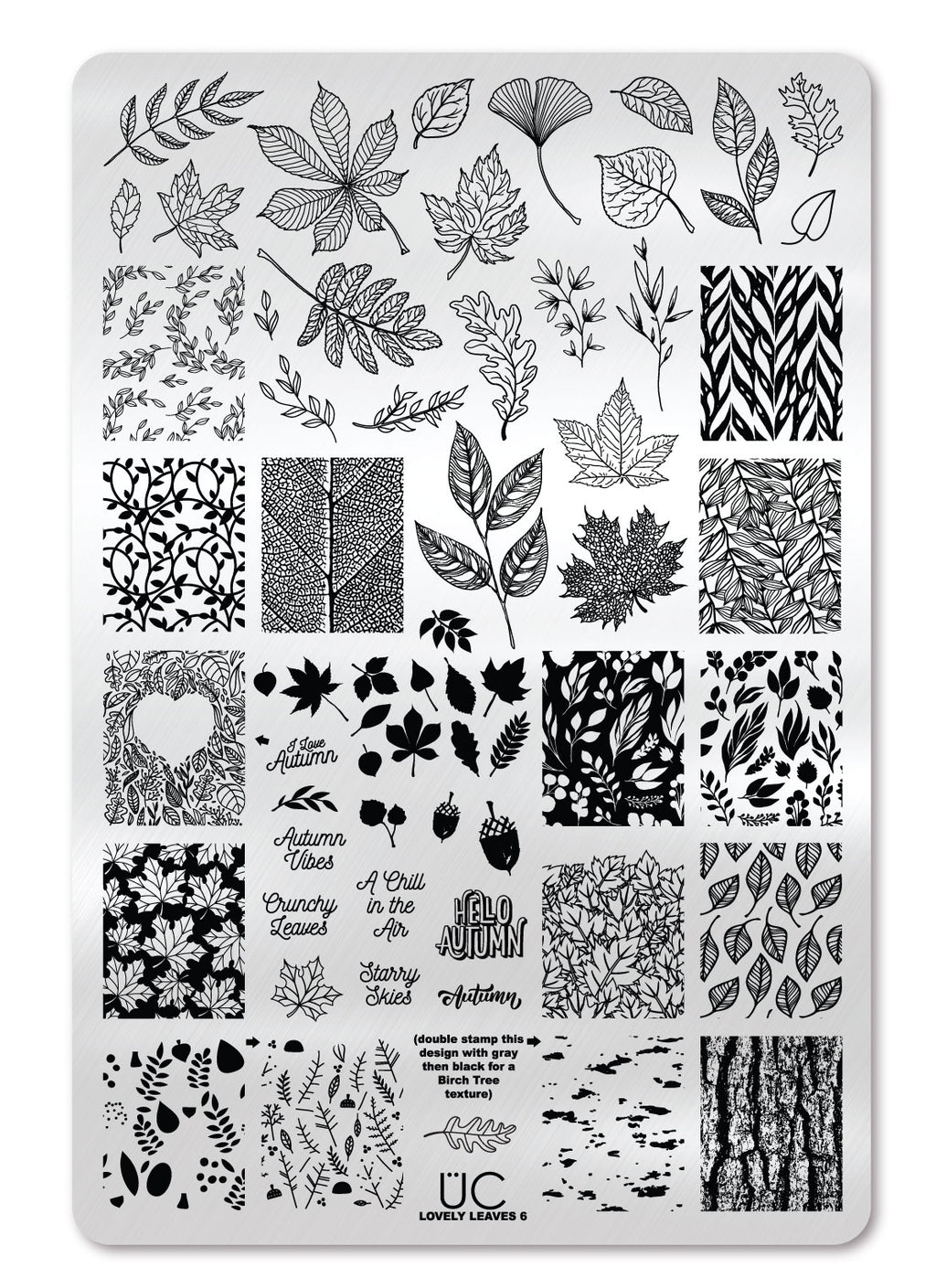 Drift freely in the wind like leaves do and stamp your nails with this stamping plate of beautiful leaves, acorns, tree bark, heart and quotes for your Fall nails.