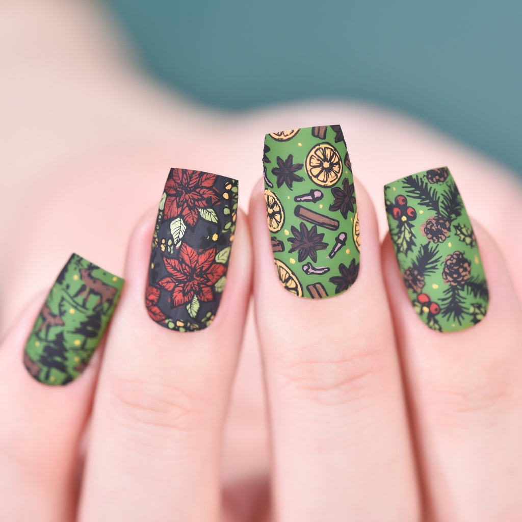 A festive stamping plate packed with winter botanicals and cozy holiday details. Stamp elegant poinsettias, pine branches, bows, ornaments, woodland animals, snowy scenes, and layered foliage designs perfect for detailed seasonal nail art.