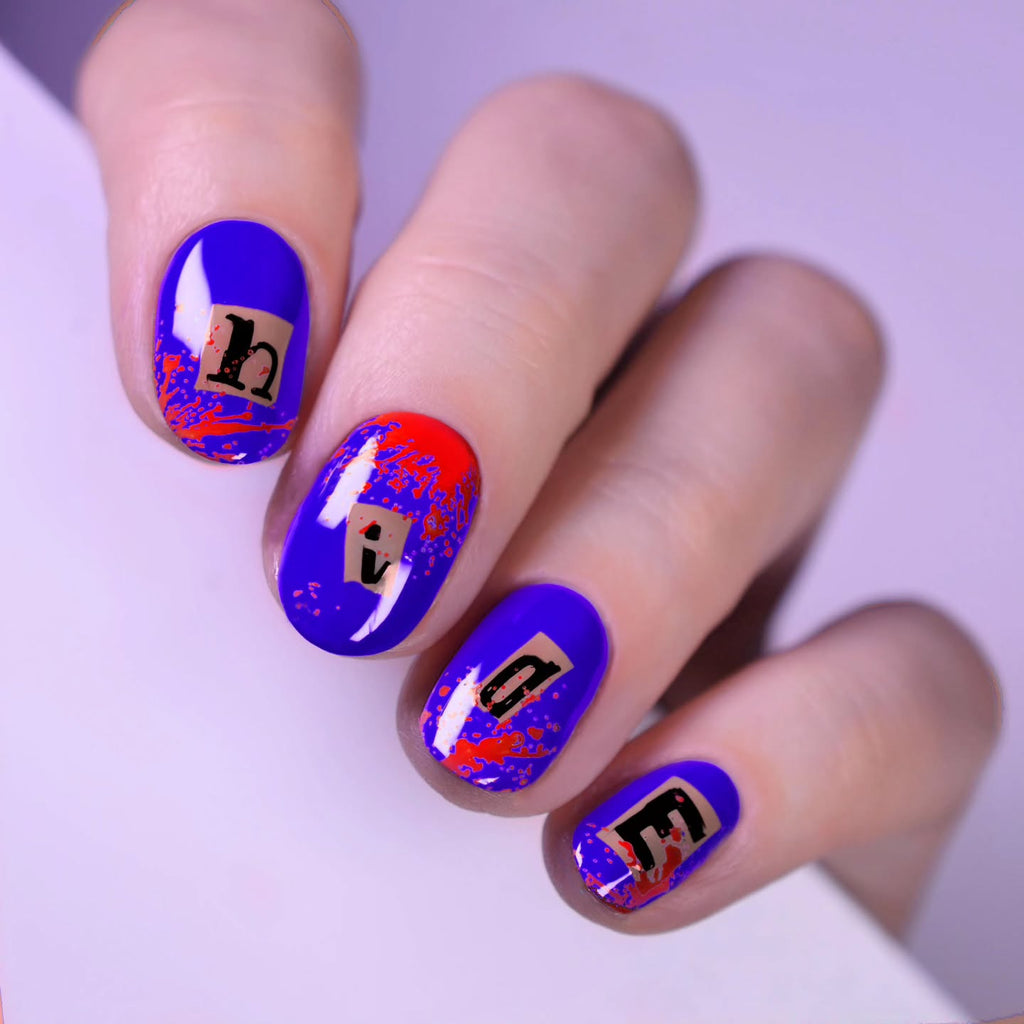 This plate is packed with crime-scene inspired details—from police badges, caution tape, and fingerprint patterns to magnifying glasses, footprints, and classic mystery game references. You’ll find clever sayings like “Murder Shows & Comfy Clothes,” “Cold Case Files,” and “Dateline & Wine” alongside quirky icons like a typewriter, detective pipe, and even an adorable detective bear. For bold statement nails, try the dripping blood design, splattered ink blot, or build-your-own ransom note alphabet.